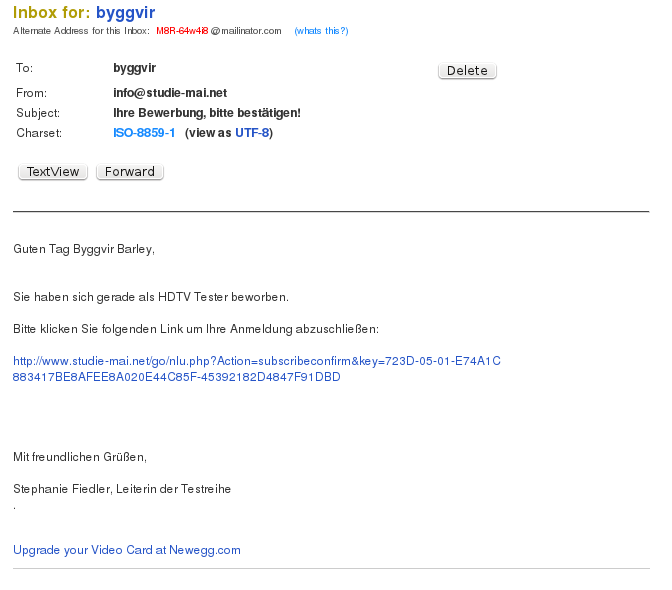 Gibt folgt man den Links in den Mails für die HDTV-Studie landet man auf einer Anmeldeseite. Ich habe mal ein paar Daten und ein Mail Adresse in dem Formular eingegeben. Nach Abschicken erhält man eine Mail, in der ein Bestätigungslink steht.