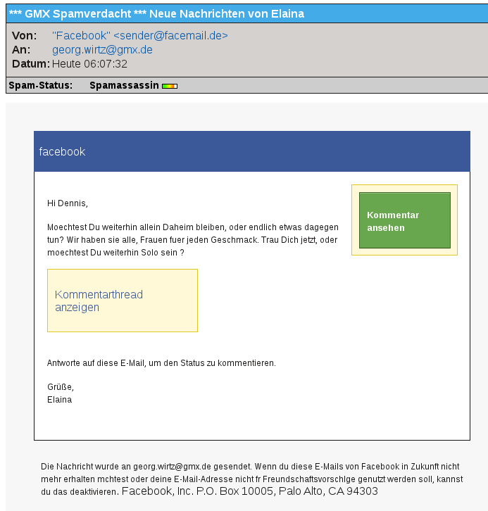 Werfen wir einen weiteren Blick in die Mail. Eine deutsche Mail mit ausgelassenen Umlauten ist schon ungewöhnlich. Facebook ist normalerweise besser.