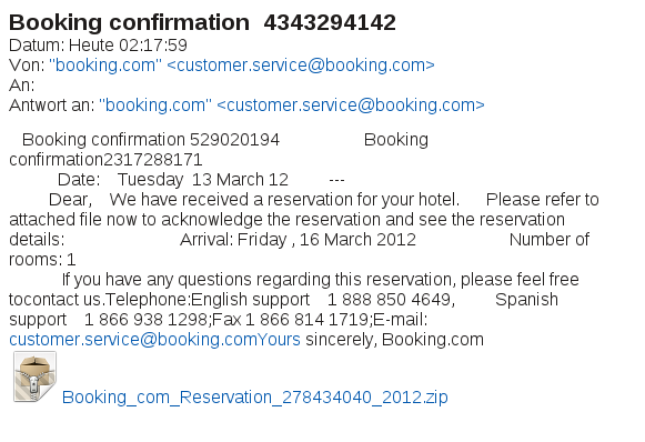 Heute sind gleich zwei Buchungsbestätigungen im Postfach eingetroffen. Nur habe ich meine Buchung schon vor ein paar Tagen vorgenommen und es gibt keine Veranlassung mir heute zwei Bestätigungen zu schicken. Es handelt sich bei den Mails nicht um echte Buchungsbestätigungen, sondern um ein Trojanisches Pferd. Besonders gut gemacht ist die Mail nicht. Zum einen gibt es keinen Empfänger, was bedeutet, mein Adresse ist nur in Blindkopie beteiligt. Warum sollte booking.com dies tun? Zweitens sind zu wenig Informationen in der Mail, womit ich wohl zum Öffnen des Anhanges verleitet werden soll. Drittens ist die Mail sehr kurz und extrem schlecht formatiert. Am Ende der Mail Adresse fehlt eine Leerstelle, so dass das Yours mit der Adresse zu customer.service@booking.comYours verschmilzt. Ein Anhang im ZIP-Format sollte immer Verdacht erregen und einen Blick in das ZIP-File zeigt: Hier wurde ein ausführbares Programm gleichen Namens eingepackt. Dies stinkt gewaltig nach einem trojanischen Pferd. ClamAV und Antivir haben allerdings nicht angeschlagen. Eine Prüfung bei VirusTotal ergibt 17 Treffer von 43 Virenscanner. Mit einer ersten Analyse vor knapp 5 Stunden ist der Gaul noch ein junges Fohlen.