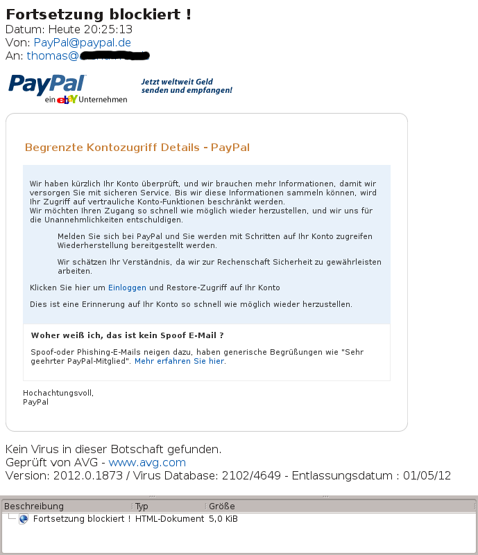 Ich habe bei Paypal nachgelesen, wie ich echte E-Mails erkennen kann. (Gut, dass ich in diesen Punkten einen robusten Magen habe.) Ich darf mal zitieren: