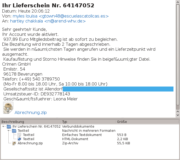 Oh Schreck, wofür soll ich 937,89 Euro Mitgliedsbeitrag zahlen? Bevor Panik ausbricht, genauer hinschauen. Die Firma Crimen GmbH wird von Google nicht gefunden, die Vorwahl 05403 gehört zu Bad Iburg, Beverungen hat die Postleitzahl 37688, die Umsatzsteuernummer ist ungültig, die E-Mail Adresse „n@…“ nutze ich nicht und hartley chakkala heiße beim besten Willen nicht. Der Blick in den Anhang offenbart: Die übliche – unter Windoof – ausführbare Datei. Schlechter ist es kaum noch möglich.