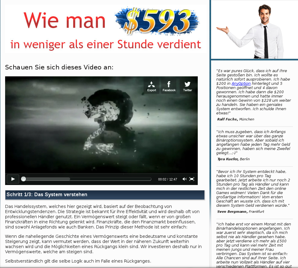 Auf den Seiten sind dann aber Videos zu sehen, die beschreiben, wie man ganz einfach mit wenig Aufwand und völliger Unkenntnis viel Geld verdienen kann. Die Anmeldung als Binary Broker fehlt natürlich auch nicht.