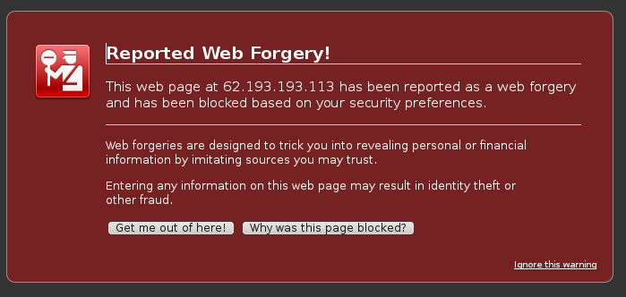 Grundsätzlich könnte es sich hier auch um Rechner mit dynamischer IP Adresse handeln. Bei Aufruf der Links mit den IP-Adressen wart Mozilla Firefox bei jeder Seite vor dem Aufruf. Reported Web Forgery! In Googles Chrome erscheint trotz der richtigen Einstellung keine Warnung. Grundsätzlich könnte es sich bei diesen Seiten auch um „dynamische“ IP-Adressen handeln. Einige Adressen funktionieren nicht mehr und die Adressen wurde offenbar durch den Hoster gesperrt.