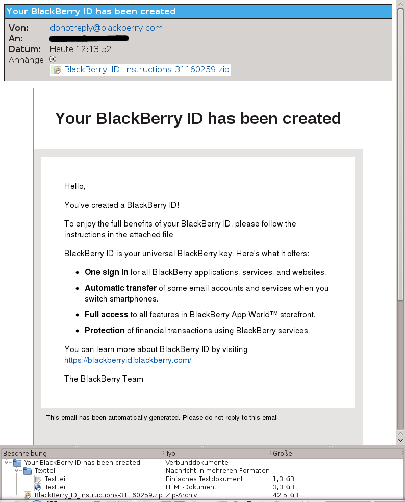 <!DOCTYPE HTML PUBLIC "-//W3C//DTD HTML 4.0 Transitional//EN"> <HTML><HEAD> <META http-equiv=Content-Type content="text/html; charset=iso-8859-2"> <STYLE></STYLE> </HEAD> <BODY> <!DOCTYPE html PUBLIC "-//W3C//DTD HTML 4.01 Transitional//EN" "http://www.w3.org/TR/html4/loose.dtd"> <html dir="ltr"><head><meta http-equiv="Content-Type" content="text/html; charset=UTF-8" pageEncoding="UTF-8"></head> <body dir="ltr"> <table width="647px" border="0" align="center" cellpadding="0"cellspacing="0" bgcolor="#FFFFFF"> <!-- Header Banner --><tr style="height:120px;"><td align="center" style="padding:5px; border-style: solid; border-width: 1px; border-color: #949494; border-bottom-width:0px"> <font size="6" face="Arial"> <b>Your BlackBerry ID has been created</b></font></td></tr> <!-- Content, grey background --> <tr><td style="width:647px; background-color:#E6E3E3; padding:15px; border-style:solid; border-width: 1px; border-color:#949494"><!-- Content, white background --><table width="615px" border="0" align="center" cellpadding="0"cellspacing="0" style="background-color:#FFFFFF; font-family:sans-serif; color:#000000;"><!-- Content, text --><tr><td style="width:615px; padding-left:45px; padding-right:45px; padding-top:30px; padding-bottom:30px;" colspan="3"> <div><p>Hello,</p><p> You've created a BlackBerry ID! </p> <p>To enjoy the full benefits of your BlackBerry ID, please follow the instructions in the attached file</p> <p>BlackBerry ID is your universal BlackBerry key. Here's what it offers: <ul> <li style="margin-bottom: 10px;"> <b>One sign in</b> for all BlackBerry applications, services, and websites.</li> <li style="margin-bottom: 10px;"><b>Automatic transfer</b> of some email accounts and services when you switch smartphones. </li> <li style="margin-bottom: 10px;"><b>Full access</b> to all features in BlackBerry App World™ storefront.</li><li style="margin-bottom: 10px;"><b>Protection</b> of financial transactions using BlackBerry services.</li></ul></p><p>You can learn more about BlackBerry ID by visiting <a href=https://blackberryid.blackberry.com/>https://blackberryid.blackberry.com/</a> </p><p>The BlackBerry Team</p><div style="height:1px;font-size:1px;"> </div> </div></td></tr><!-- Copyright --><tr><td style="padding:10px; background-color:#E6E3E3; font-size:80%;" colspan="3"><div>This email has been automatically generated. Please do not reply to this email. <br></br><br></br>If you have not previously indicated that you wish to receive emails from Research In Motion Limited and/or its affiliated companies regarding exclusive offers and updates about BlackBerry products and services and you would like to do so, please click <a href=https://www.blackberry.com/eSubscriptionsManagement/>here</a>. <br></br><br> </br>Research In Motion Limited, 295 Phillip St., Waterloo, Ontario, Canada, N2L 3W8<br></br><br></br>2012 Research In Motion Limited. All rights reserved. BlackBerry, RIM, Research In Motion and related trademarks, names and logos are the property of Research In Motion Limited and are registered and/or used in the U.S. and countries around the world.</div></td></tr></table></td></tr></table></body></html> </BODY></HTML>