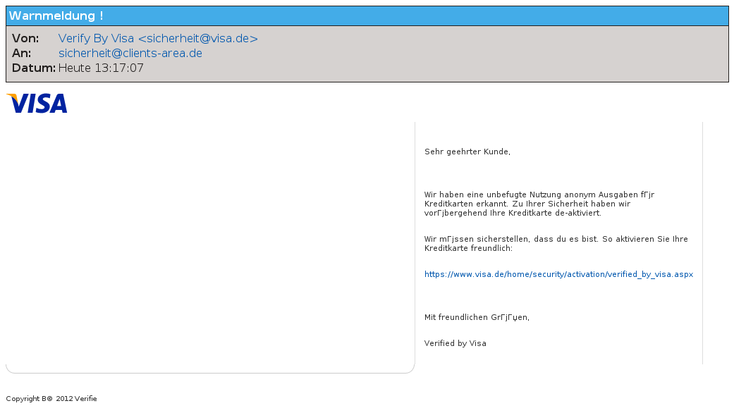 Jetzt sind angebliche Warnmeldungen von VISA im Umlauf.
