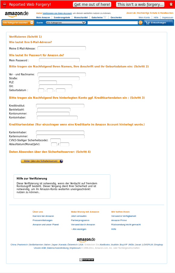 Während es sich bei der E-Mail um eine einfache Text-Nachricht handelt, ist die Seite mit Hilfe der originalen Elemente von Amazon sehr überzeugend nach gebaut. Die Seite gibt sich alle Mühe, den Zugriff auf den Quellcode zu erschweren, Dazu wird die rechte Maustatse abgefangen, was für den Web Developer Werkzeugkasten jedoch kein Hindernis darstellt. Ist dieses Hindernis überwunden, zweigt sich, dass der Quelltext als JavaScript verschleiert ist, was seine Lesbarkeit einschränkt. Auch hier hilft der Web Developer Werkzeugkasten, der eine Option bietet sich den erzeugten Quelltext anzuzeigen. Besondere Erkenntnisse ergeben sich dadurch allerdings nicht. Im wesentlichen werden die einzelnen Bausteine direkt von Amazon genommen. Wenn ich es richtig gesehen habe, wird das Formular über den Server kundenstatus.eu abgeschickt.