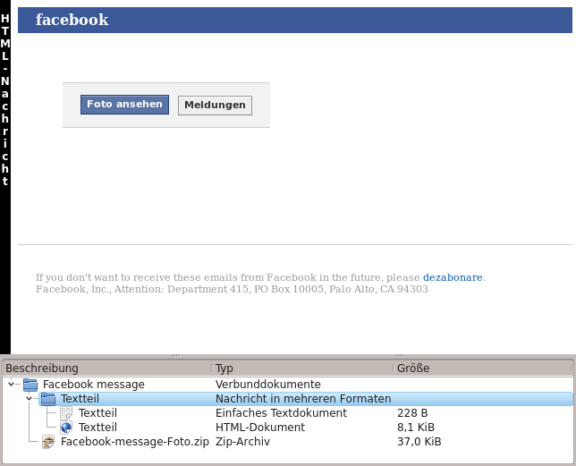 Eine angebliche Mail von Facebook enthält an Stelle des Bildes ein ZIP-Archive mit einem Trojaner, bei dem eine doppelte Dateiendung darüber hinwegtäuschen soll, dass es sich bei der eingepackten Datei um ein Programm und nicht um ein Bild handelt.