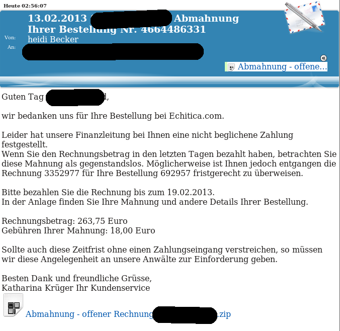Ich habe heute eine e.mail von echitica bekomme und die erste frage die ich mir stellte war :“was ist echitica und warum rechnung und warum mahnschreiben ? “ ich war total irritiert und als ich dann 268 euro gelesen hatte war ich erst recht total verwirrt . Dann fande ich diese seite . Und bin jetzt noch mehr durch einander ! Erstens ich habe keine pralinen bestellt und zweitens ein trojanisches pferd ? Also ein virus! Also bedeutet das nun das ich nichts bezahlen muss ? Und ich jaa nicht den anhang öffnen soll ? Hilfe ! Bitte !