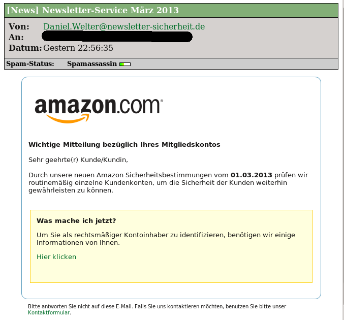 In solchen Fällen, ist immer Vorsicht geboten. Zwar ist eine korrekte Anrede kein verlässliches Zeichen, denn gute Adressdatenbanken liefern den richtigen Namen. Eine fehlenden, pauschale oder falsche Anrede deutet darauf hin, dass eine E-Mail nicht vom angeblichen Absender stammt. In meinem Fall kommt hinzu, dass diese E-Mail an eine Adresse geschickt wurde, die ich bei Amazon nicht hinterlegt habe.