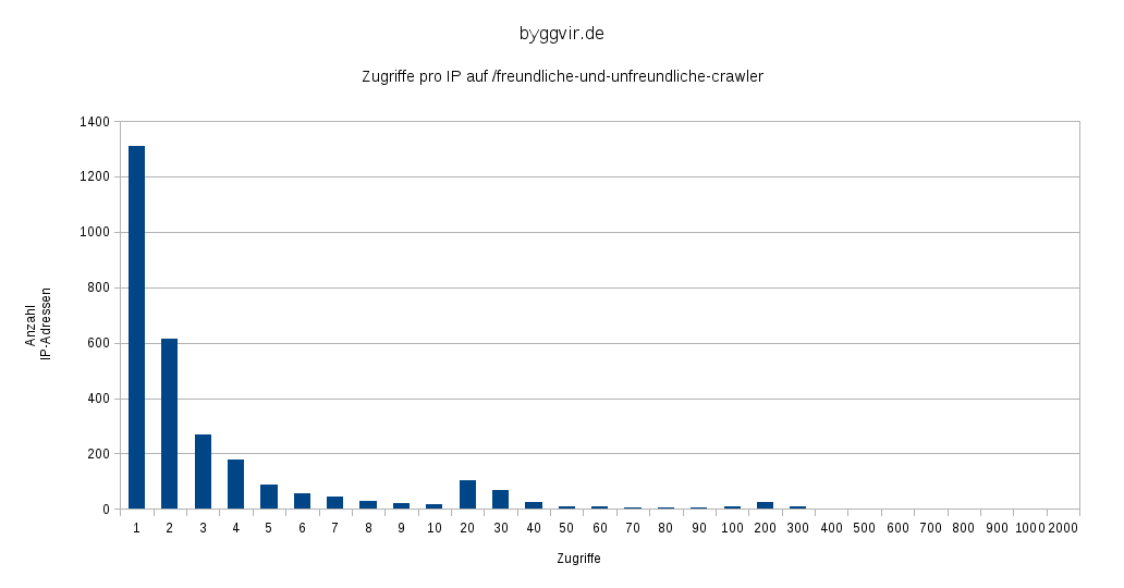 Ein fast die Hälfte der Rechner greift nur einmal auf die Seite zu. Das geht in erster Näherung in Ordnung. Warum sollten sie es mehrfach tun? Das von IP-Adressen mehrfach eine Seite angefordert wird, ist auch nicht unbedingt ungewöhnlich, denn hinter einer Adresse könnte der Proxy eines Providers stehen. Aber es gibt auch Host die mehr als 200 mal auf die Seite zugegriffen haben.