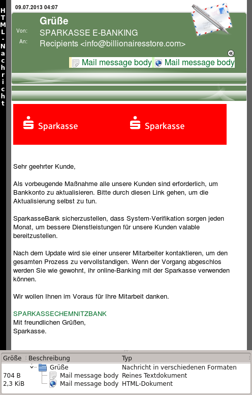 Der Link auf die gefaked Seite (toomuchrawfish.com/misctravel/www.sparkasse-chemnitz.de/login.html) ist ziemlich schlecht getarnt und der Account zu der Seite toomuchrawfish.com (zu viel roher Fisch) ist bereits suspendiert worden. Roher Fisch ist ein Risiko und für exponierte Gruppen wie Schwangere, Kinder, Immunsupprimierte und ältere Menschen abzulehnen.[ref]Siehe derStandart.at: Roher Fisch ist ein Risiko vom 14. Juni 2010, 16:54[/ref] Also, nicht essen. Möglicherweise schlägt er aufs Hirn.