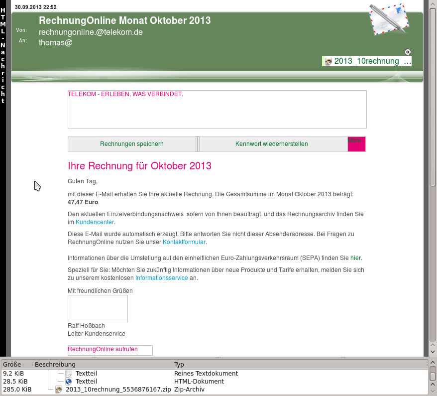 Tipp: Merken Sie sich Ihre Buchungskontonummer, es dürften die ersten oder letzten drei Stellen reichen, und die Betrüger haben weniger Chancen, auch wenn Sie mit Namen angeredet werden. Außerdem: Die Telekom verschickt keine ZIP-Dateien.