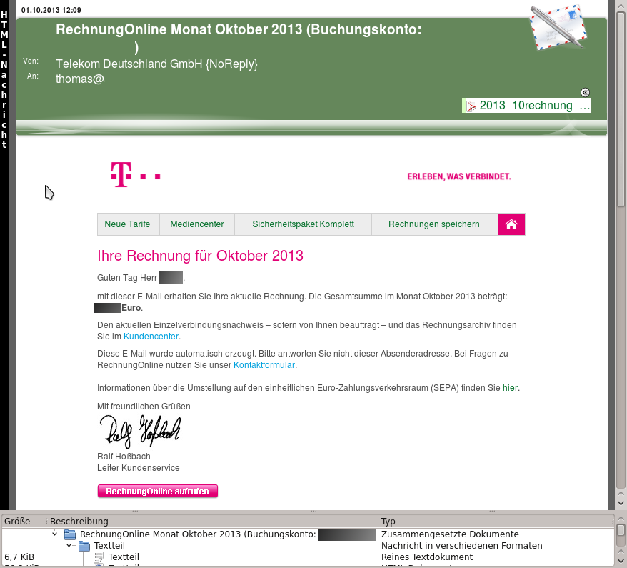 Gestern kamen einige gefälschte Telekom Rechnungen für den Monat Oktober (Original siehe oben, Fälschung siehe unten) herein. Das Original gab es heute. Wie üblich ist die Rechnung bei der Fälschung keine PDF-Datei, sondern eine ZIP-Datei mit einem Trojaner; klar erkennbar an der doppelten Dateiendung „.pdf.exe“. Weitere Unterschiede zur Original-Rechnung: