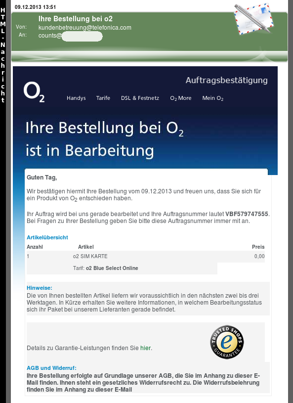 Gerade kam die obigen Mail einer angeblichen Bestellung bei O2 ins Postfach herein. Während drei Mails als SPAM markiert wurde, kam eine Mail durch, sonst wäre sie mir wahrscheinlich nicht aufgefallen.