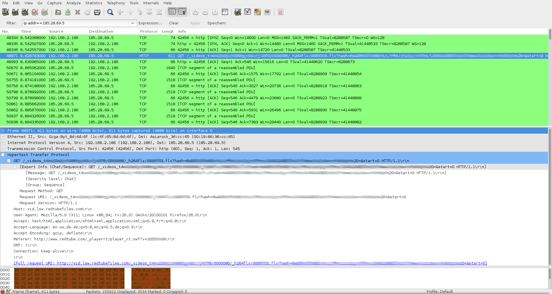 Nach dem obligatorischen TCP 3-way-hand-shake wurde der Server mit dem HTTP GET-Befehl nach dem Video gefragt. Ob und wie weit der Server das Video ausgeliefert hat, zeigen erst die weiteren TCP Pakete. Starten und Stoppen des Video kann nicht beobachtet werden, da darüber keine Information an den Server gesendet wird. Nach der Abfrage sendet der Server den Film von Anfang bis Ende zum Client. Aufgrund des TCP-Protokoll gibt es auch keine Lücken. Bei einer langsamen Verbindung ruckelt das Video. Bei einer schnellen Verbindung füllt sich der Puffer schneller als das Video abgespielt werden kann. Nur wenn der Nutzer über den schon geladenen Teil hinaus vorspult, schickt der Client ein Folgepaket an den Server mit der Bitte, Teile des Videos zu überspringen. Solange die Seite im Browser geöffnet bleibt, wird – vorausgesetzt der Speicher reicht – der gesamte Film heruntergeladen. Einige Nutzer scheinen hier HTTP-Streaming[ref]Siehe WikiPedia: HTTP-Streaming[/ref] mit einen Video-Broadcast zu verwechseln. Dies findet bei RedTube nicht statt.