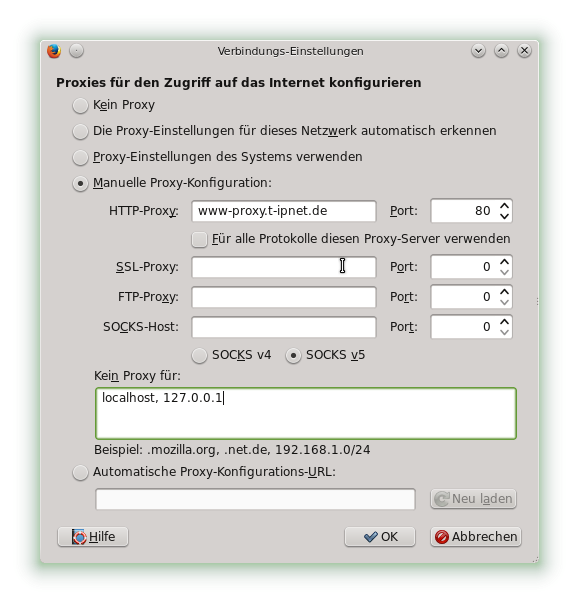 Einen Proxy, z.B. der Telekom, können Sie im Browser wie folgt selbst einstellen.