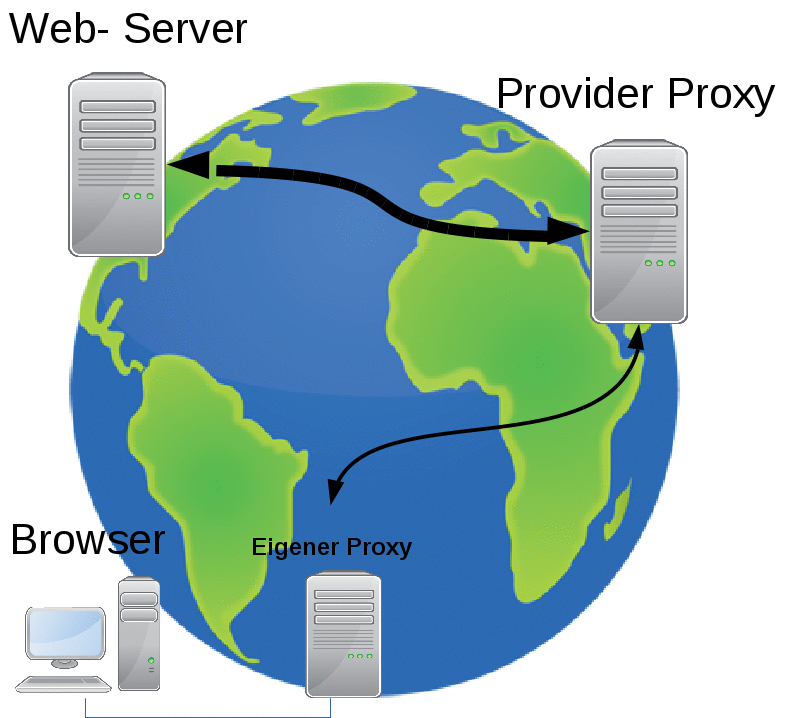 Wer Sie überwachen will, könnte auch einen (transparenten[ref]Transparent bedeutet, er ist da aber Sie sehen ihn nicht.[/ref]) Proxy-Server[ref]Z.B. auf der Basis von Squid[/ref] (kurz: Proxy) zwischen Ihrem Internet-Anschluss (z.B. DSL-Router) und Ihrem Rechner installieren. Der Proxy fängt Ihre Anfragen ab und stellt die Anfrage (leicht modifiziert) selbst an die Web-Server. Er empfängt deren Antworten und leitet diese an Ihren Browser weiter. Er vertritt die angeschlossenen Rechner gegenüber den Servern. (Rechtsanwälte oder Notare sind Proxies in Rechtsfragen.) Ein Proxy speichert wie Ihr Browser alle eingehenden Antworten in einem Cache. Wird die gleiche Datei ein zweites Mal – auch einem anderen Rechner – angefragt, muss der Proxy nicht den Server bemühen, sondern gibt die Antwort aus seinem Cache zurück. Dies entlastet Leitungen und Server. Dies bedeutet auch, dass nicht jede Ihrer Anfragen bis zum Web-Server gelangt. Hat jemand anderes die gleiche Datei nachgefragt, bekommt der Web-Server möglicherweise nichts von Ihrer Anfrage mit. Erreicht Ihre Anfrage den Web-Server, kommt sie für diesen vom Proxy. – Zu einem kleinen Haken an der Sache komme ich später.
