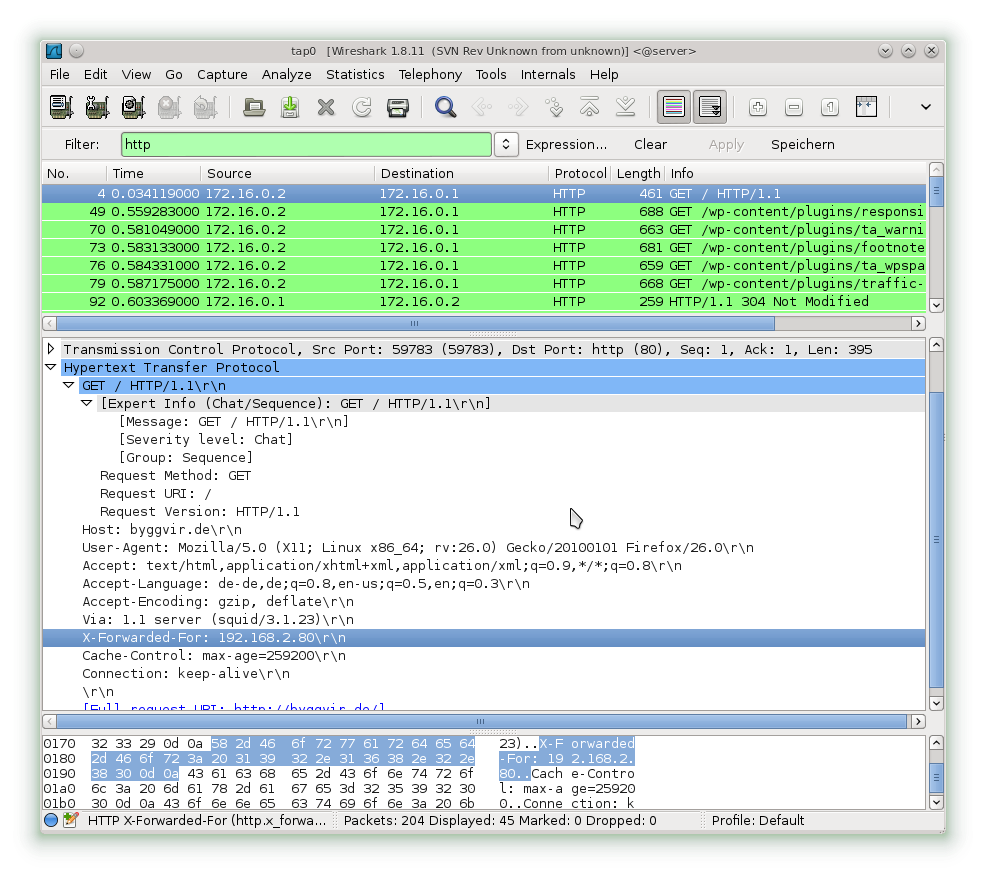 Hier sind nur die IP-Adressen des Web-Servers (172.16.0.1) und die externe des Proxy (172.16.0.2) in den IP-Paketen.