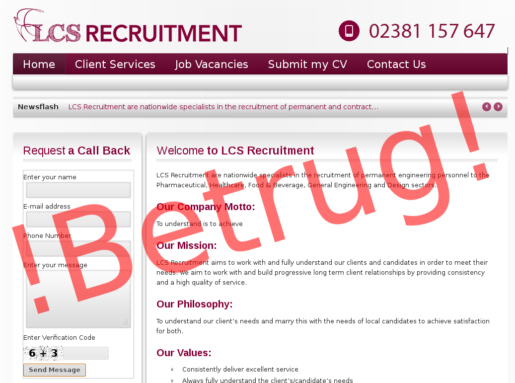 Unter der Seite lcsrecruitment.net sind wieder Bauernfänger unterwegs unter dem Deckmantel einer echten Firma unterwegs. Die Firma LCS Recruitment gibt es wirklich, die hat jedoch die Adresse lcsrecruitment.co.uk. Ein kleiner aber wichtiger Unterschied. Die gefälschte Web-Seite ist nahezu 1:1 von der Original-Seite kopiert und greift direkt auf die Scripte und Stylesheets des Originals zu.