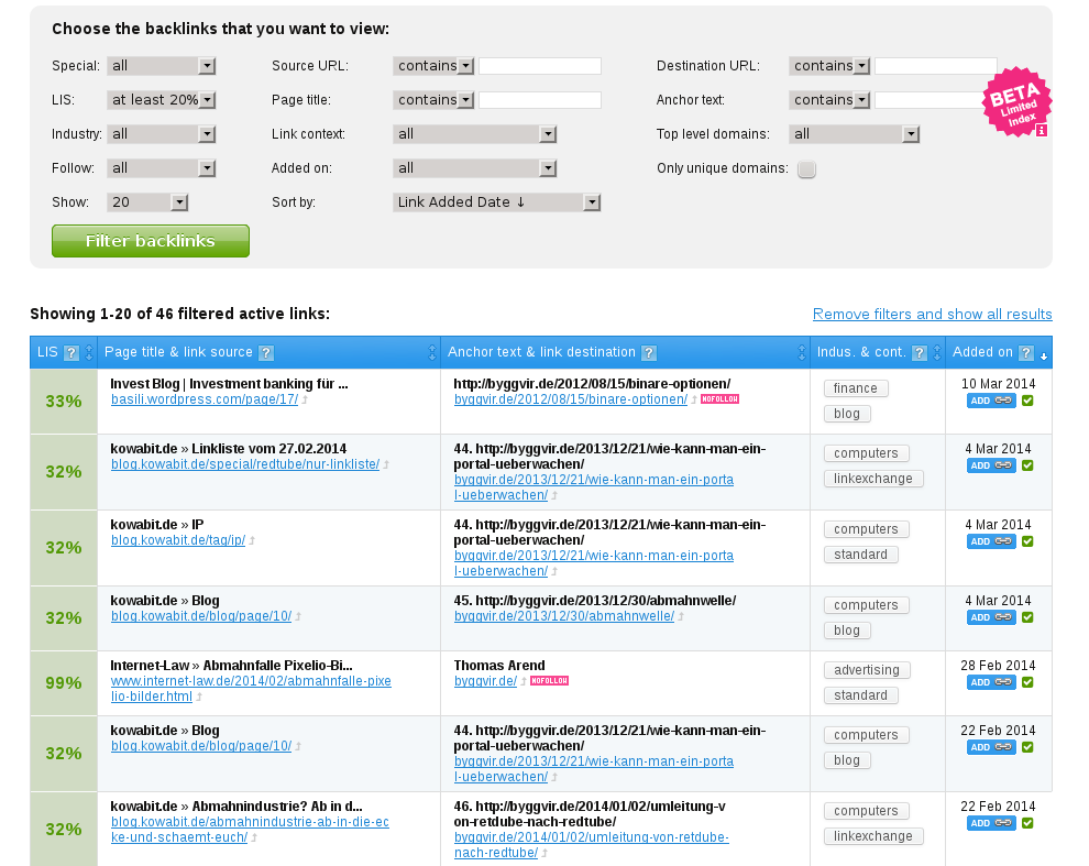 SEOkicks.de ist eine weitere deutsche Seite zur Analyse der Backlinks. Derzeit stehen mehr als 55 Milliarden Datensätze bereit.