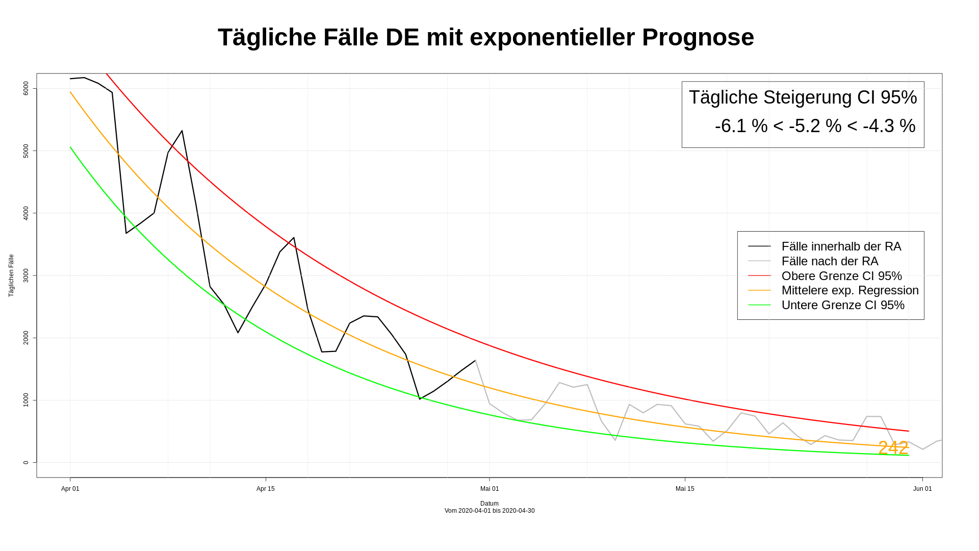 Im April ging es bergab. Grafisch deutet sich eine exponentielle Schrumpfung an. Um das zu prüfen, führen wir wieder eine lineare Regressionsanalyse auf den Zeitraum 01. – 30.04. durch. Wieder verlaufen die Fallzahlen innerhalb des CI 95%. Auch die Fallzahlen nach dem 30.04. verlaufen innerhalb des CI 95%. Diese Prognose funktioniert, obwohl Anfang Mai erste Maßnahmen aufgehoben wurden.