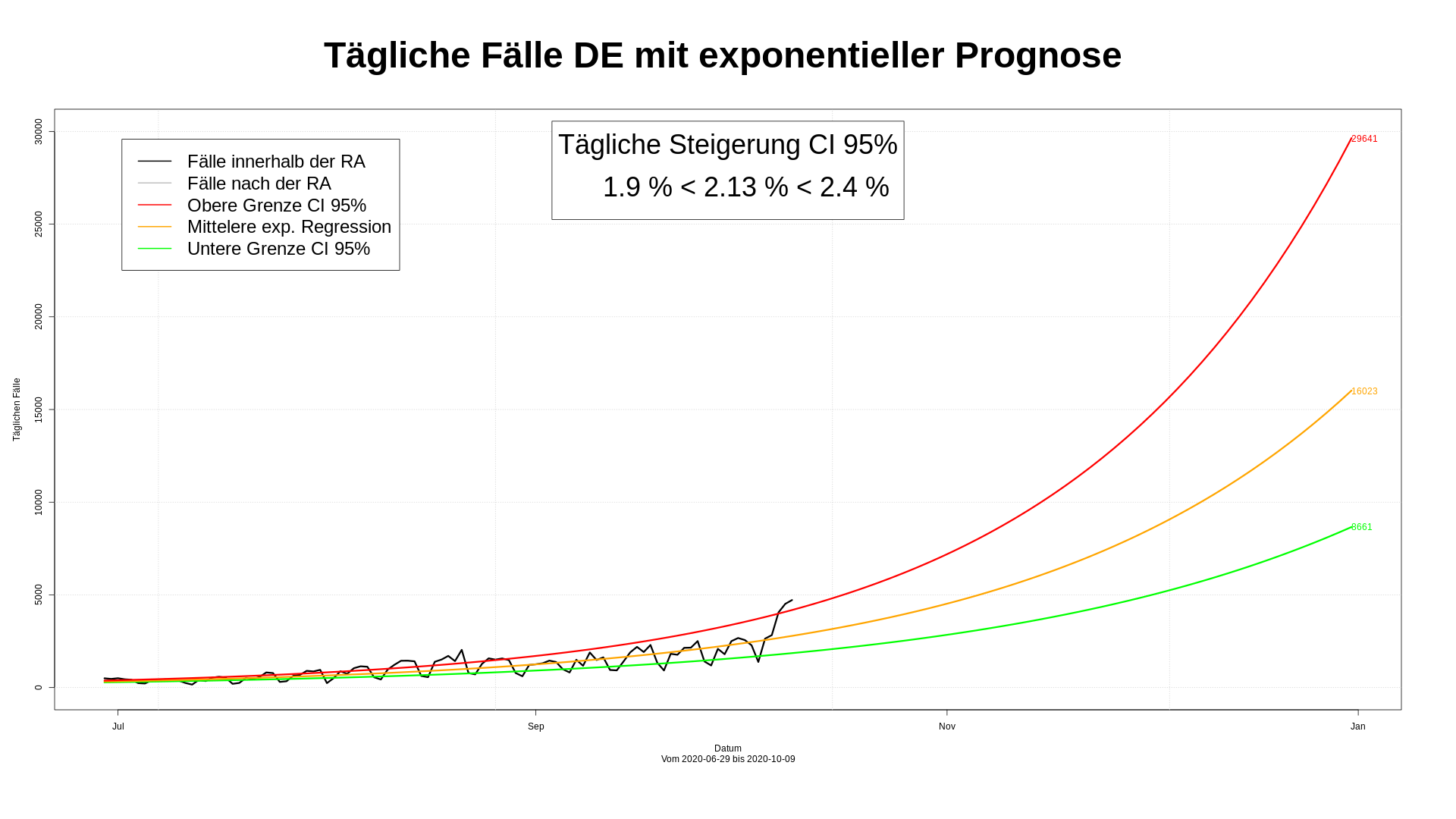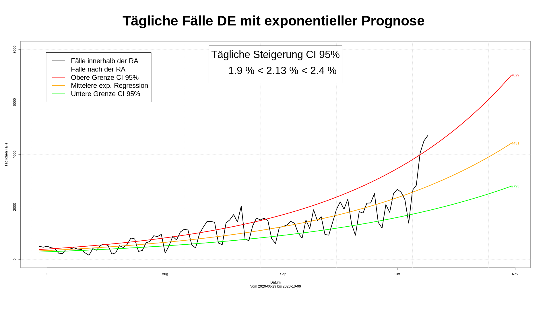 Es ist nicht  einfach, die Entwicklung der CoViD-19 Fallzahlen für DE vorherzusagen. Zum einen schwanken die Zahlen von Tag zu Tag stark, zum anderen sind sie vom Wochentag abhängig. Zum anderen sind sie vor bestimmten Ereignissen abhängig. So wurden in der Urlaubszeit mehr Menschen angesteckt, als danach. Im Herbst wird wieder mit der Zunahme der Infektionen gerechnet.