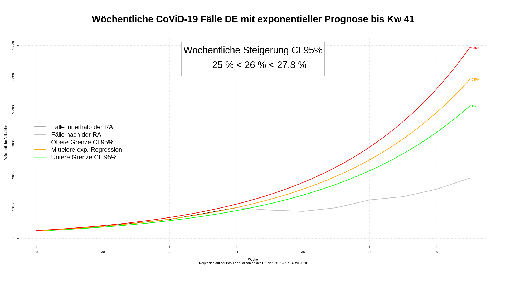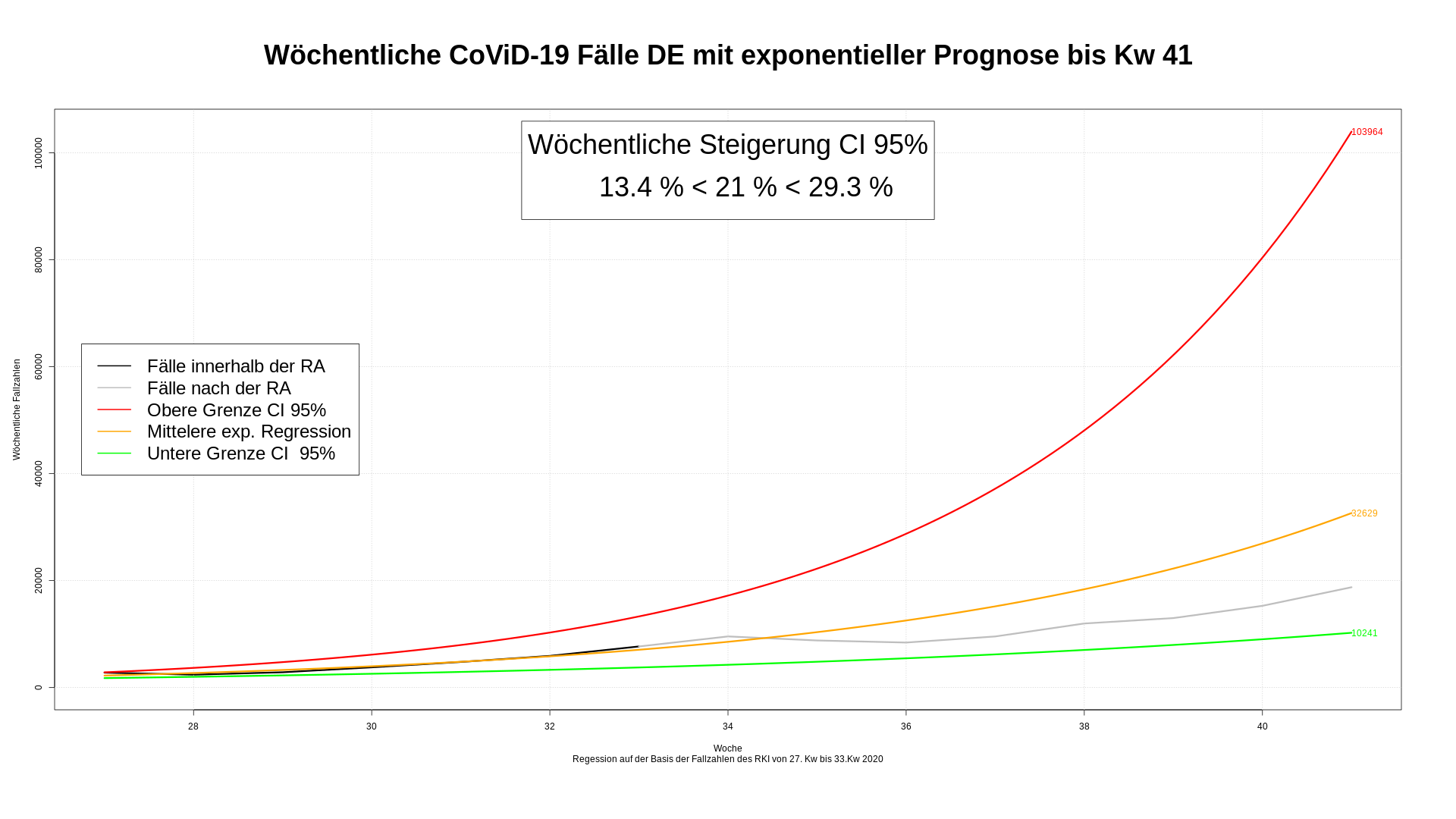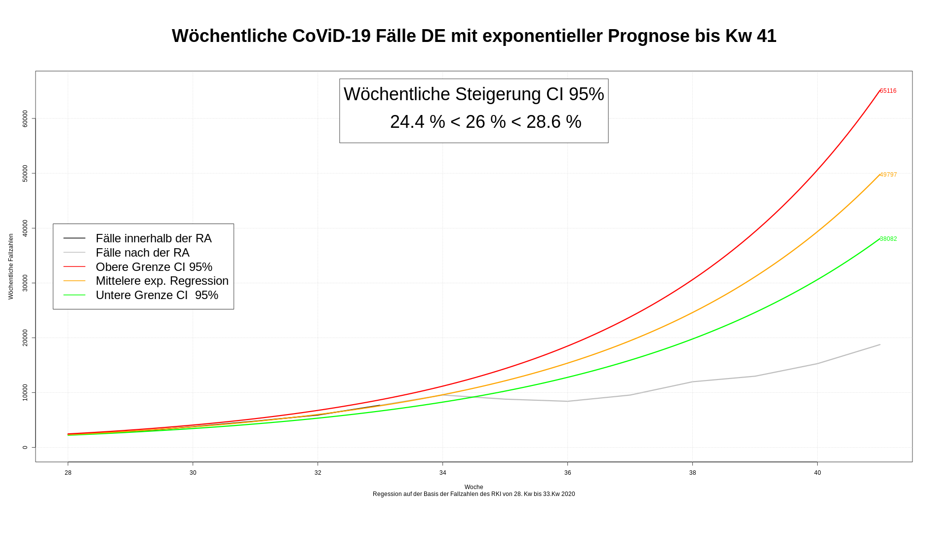 Hätten wir unsere Analyse in der mit 28. Kw begonnen, wäre die Prognose anhand der 6 Wochen ziemlich daneben gegangen. Ein  Grund ist der Ferien- und Urlaubsbuckel. Die Fallzahlen laufen zwar exakt an der mittleren Linien, aber mit Wegfall der Ursache, sinkt die Steigerung der Fallzahlen aus dem CI 95%. Es dauert zwei Wochen, bis die Fallzahlen im CI 95% ankommen. Prognosen aufgrund weniger Daten sich eben sehr unsicher.