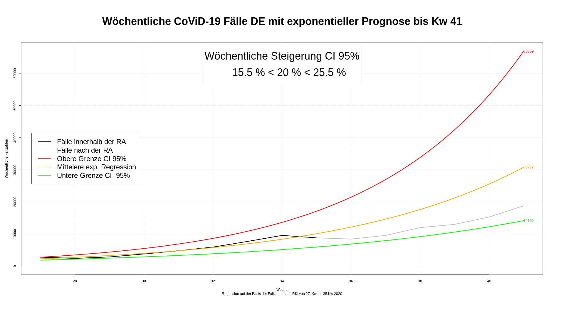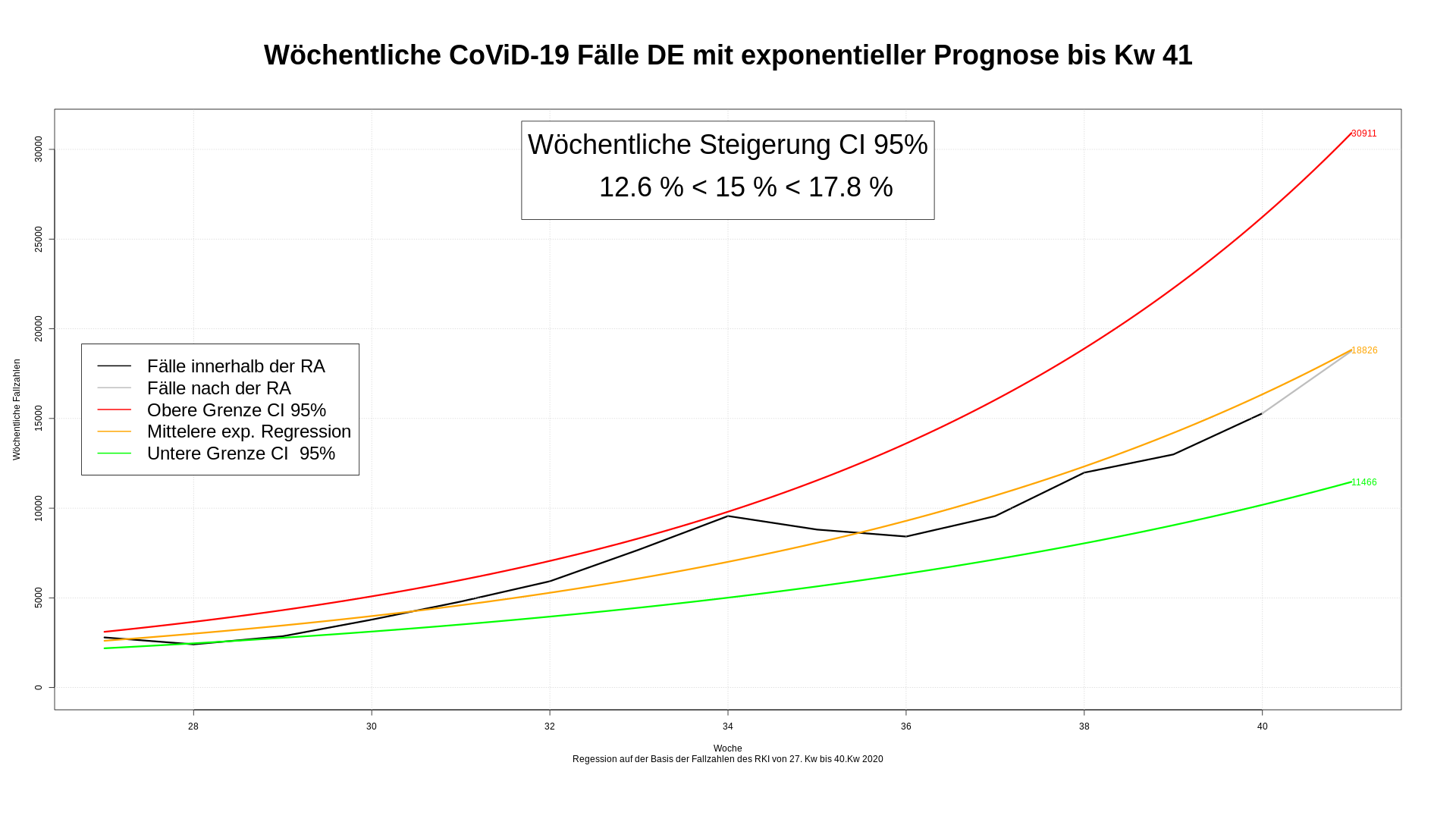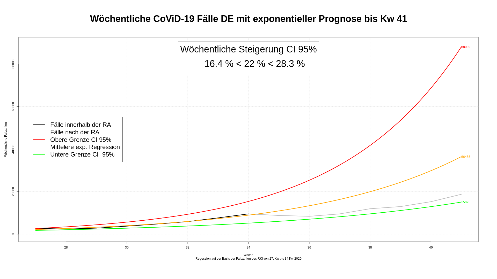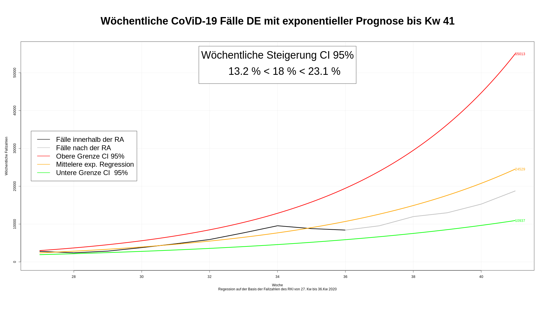 Mit der 36. Kalenderwoche bewegen sich die realen, künftigen Fallzahlen auf die näher an die Mittellinie.  Der Ferien- und Urlaubsbuckel wird langsam ausgeglichen. Unsere Schazung für die 41. Kw liegt jetzt zwischen ~11.000 und ~55.000 Fällen.  Im Mittel würden wir ~24.500 Fälle erwarten. Für die 41. Kw fehlen noch die Werte für Samstag und Sonntag. Es ist also noch Chance dem Wert Mittelwert nahe zu kommen. Auch eine Prognose mit Werten ab der 28. Kw würde ~ 27.000 Fällen wieder im tatsächlichen Bereich liegen. deshalb verzichte ich ab jetzt darauf, die Werte der 28. Kw zu betrachten.
