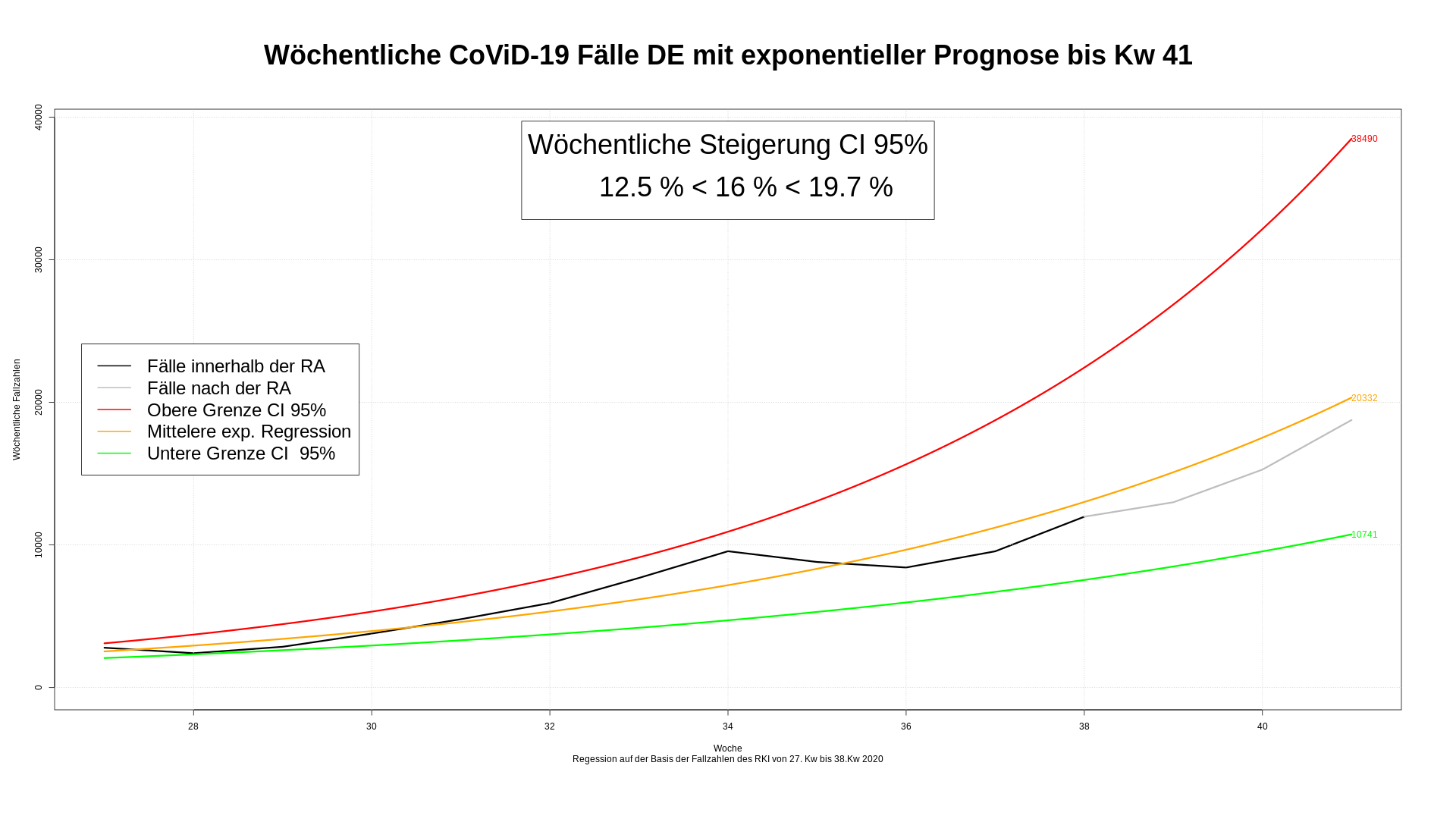 Mit der 38. Kalenderwoche bewegen sich die realen, künftigen Fallzahlen auf die näher an die Mittellinie.  Dies ist natürlich nicht weiter verwunderlich, denn die Werte der nächsten Wochen werden sich natürlich nicht dramatisch von den Vorwochen unterscheiden.