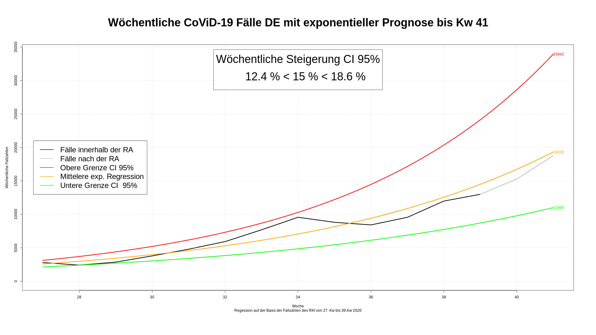 Versetzen wir uns zürck an den Anfang der 34. Kw. Uns liegen die Fallzahlen der 27.  bis 33. Kw vor. Eine Regressionsanalyse ergibt folgendes Diagramm. Schauen wir uns nun ab der 33. Kw die Fallzahlen an und extrapolieren diese auf die 40. Kw.