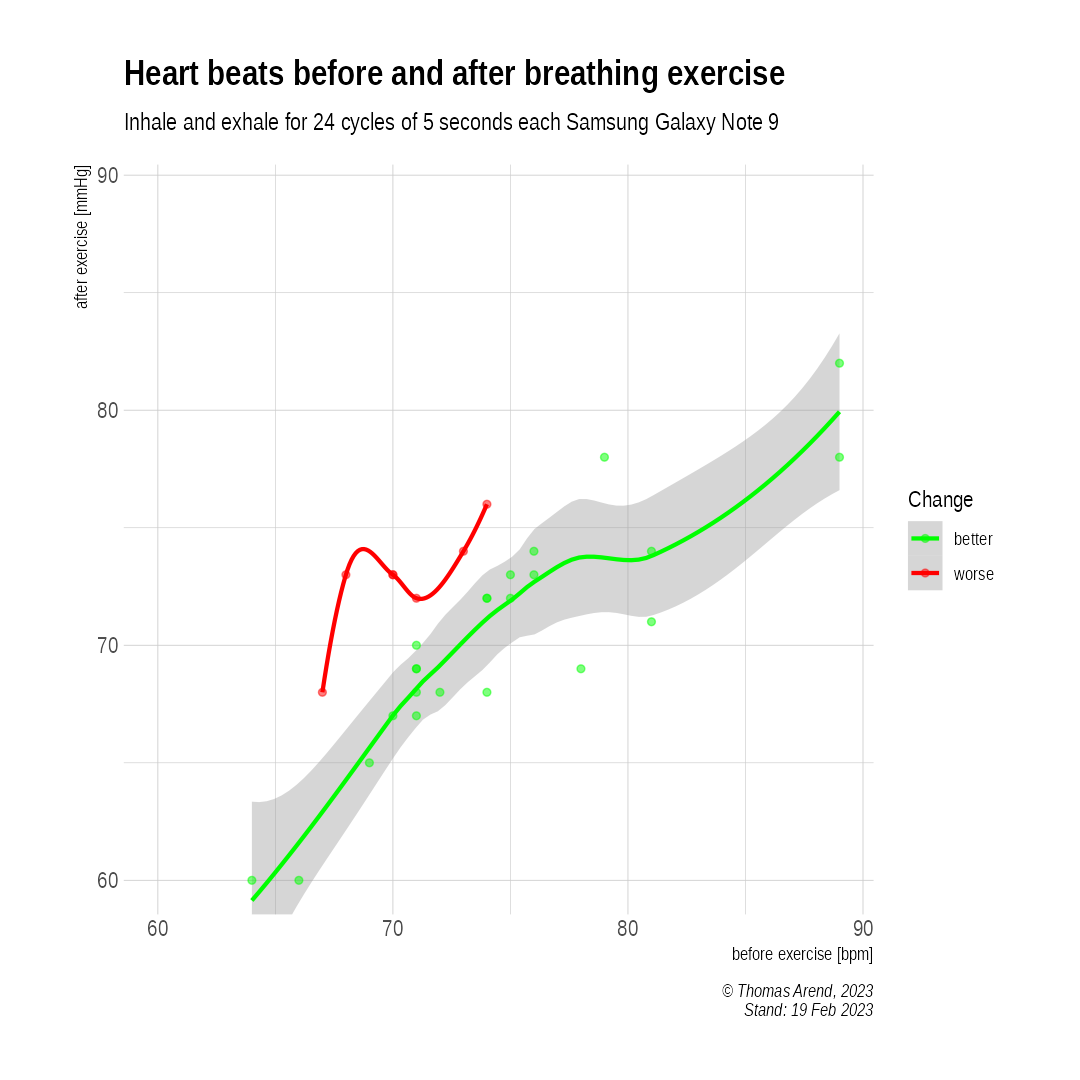 Due to the limited accuracy of the device [heart rate 1 BPM, SpO2 1%], the small range of heart rate (60-89 BPM) and SpO2 (92-97%) and the small discrete differences between the values, the normal distribution assumption was not met. Therefore, a student t test could not used for the analysis. Instead, a paired sign test was used to assess the statistical significance of the changes in heart rate and SpO2 levels before and after the breathing exercise. The sign test was conducted using the binom.test function in R.