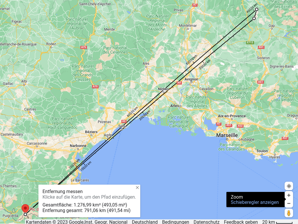 Let’s look at this on Google Maps by drawing a triangle between Pic de Noufonts, Tete de Vacheres, Grande Tete I’Obíou and back to the Pic de Noufonts.